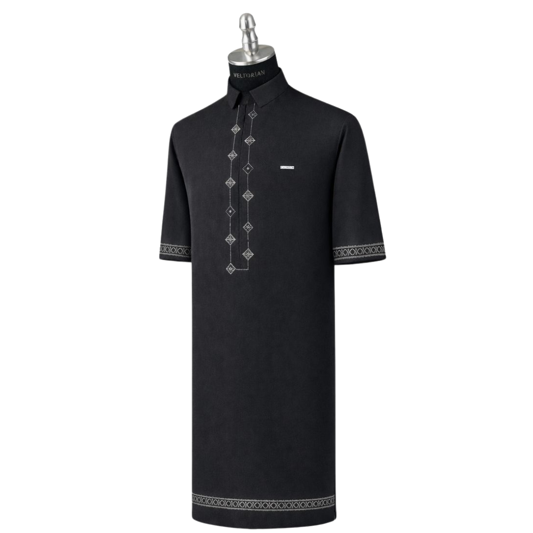 First, the structure sets the tone. The Arcseal features a clean, elongated cut that drapes with intention. The tailored shoulder line and structured fold collar create a composed profile, while the straight fall of the garment reinforces confidence and balance. As a result, the kaftan maintains its form throughout the day without sacrificing comfort.