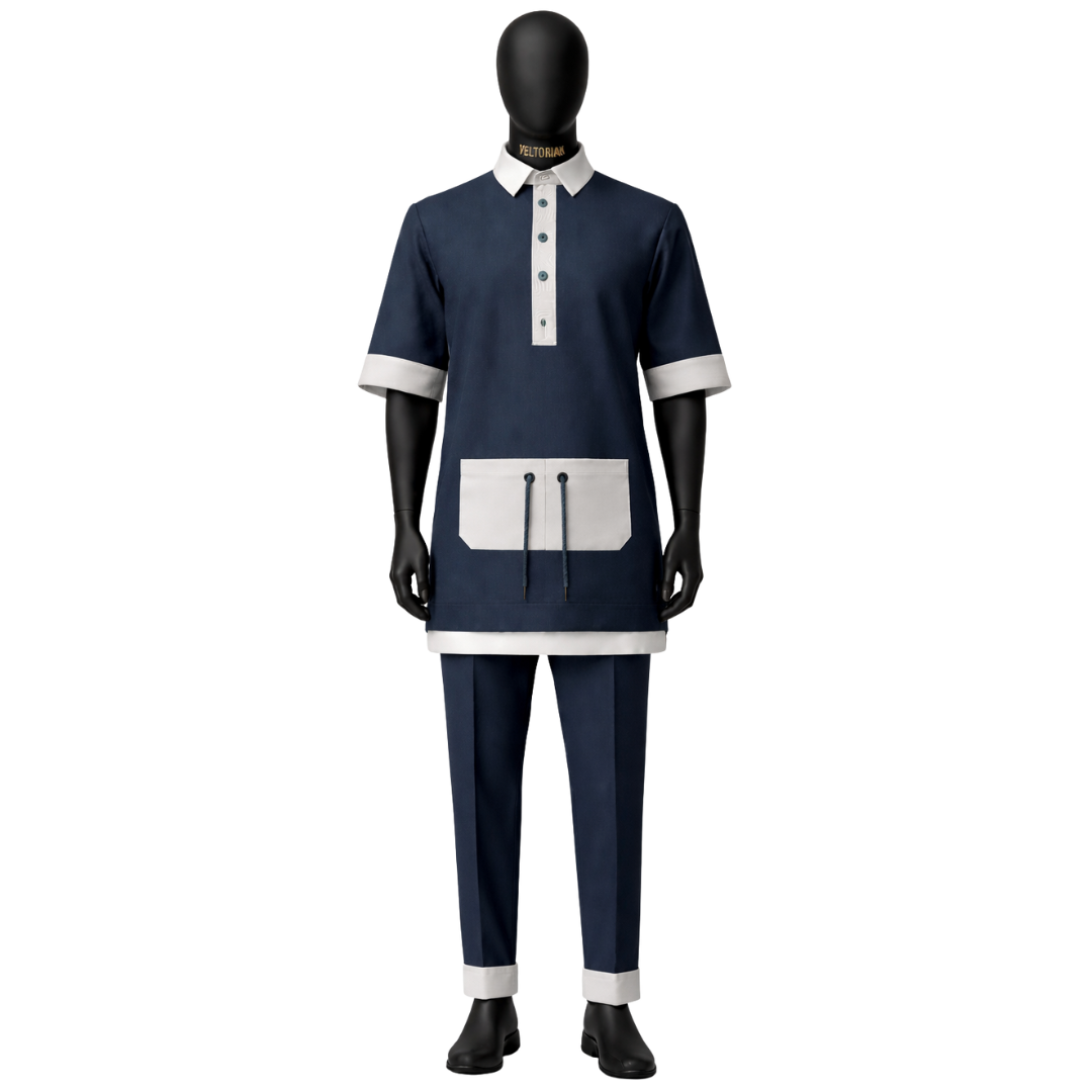 The longline tunic features a structured polo-style collar, a clean button placket, and precise contrast trims that frame the garment with subtle authority. A defining design element is the architectural front utility pocket, accented with symmetrical drawstrings. This detail introduces depth, functionality, and contemporary edge while preserving a clean, elegant silhouette. The matching tailored trousers complete the set, offering balance, proportion, and visual cohesion from top to bottom.